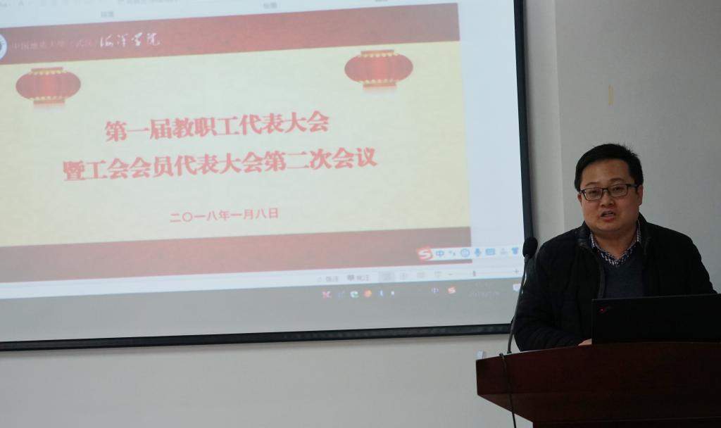 2018年1月8日,中国地质大学(武汉)海洋学院第一届教职工大会第二次会议暨第一届工会会员大会第二次会议在丝绸之路学院105室隆重开幕,会议由院党委书记解习农同志主持,工会副主席高复阳同志到会祝贺并致贺词。