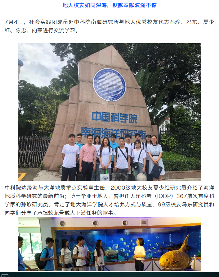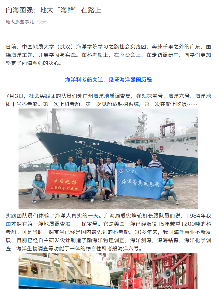 报道从“海洋科考船变迁,见证海洋强国历程”、“地大校友如同深海,默默奉献波澜不惊”、 “练就过硬专业本领,树立谋海济国之志”、“走进港珠澳大桥,找到奋斗的动力”四个专题部分对必赢线路检测中心“学海洋强国思想,践向海图强之路”的暑期社会实践活动进行详细的报道。