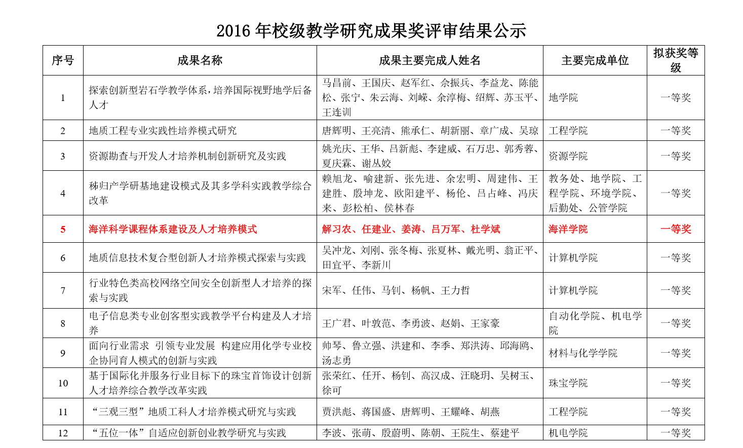 在中国地质大学(武汉)2016年校级教学成果奖评审中,根据学校相关文件精神,经个人申请、院(系)推荐、成果负责人汇报、校教学成果评审专家组审定,我院解习农、任建业、姜涛、吕万军、杜学斌等教师申报的《海洋科学课程体系建设及人才培养模式》获评校级教学研究成果一等奖。