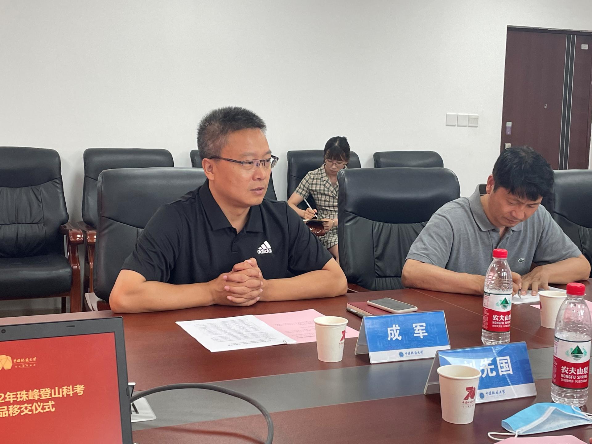 图书档案与文博部部长刘先国,校团委副书记吴迪,环境学院副院长孙自永代表各单位接收陈刚教授珠峰登山科考捐赠物品。