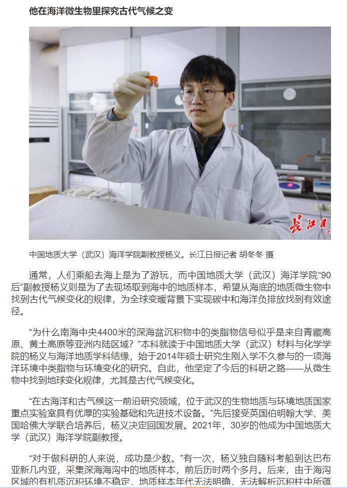 其中,长江日报记者对话必赢线路检测中心杨义副教授,报道他在海洋微生物里探究古代气候之变:通常,人们乘船去海上是为了游玩,而必赢线路检测中心“90后”副教授杨义则是为了去现场取到海中的地质样本,希望从海底的地质微生物中找到古代气候变化的规律,为全球变暖背景下实现碳中和海洋负排放找到有效途径。“做科研不枯燥,满足好奇心很有意思。”杨义说,他要一直坚持下去,实实在在拿出国家需要、对社会有用的科研成果。