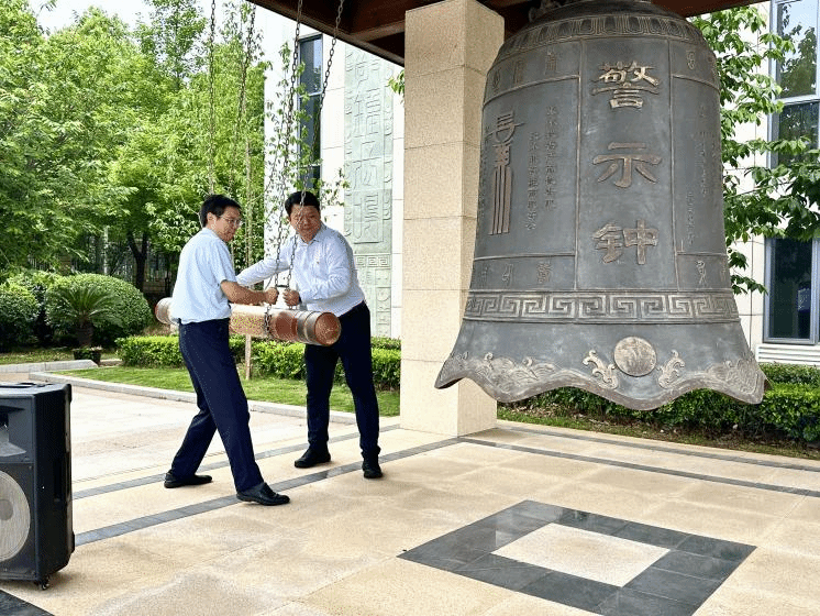 在廉政文化广场,全体党员庄严肃立,刘国华书记和武汉理工大学土木工程与建筑学院党委书记林凯共同敲响“警示钟”。
