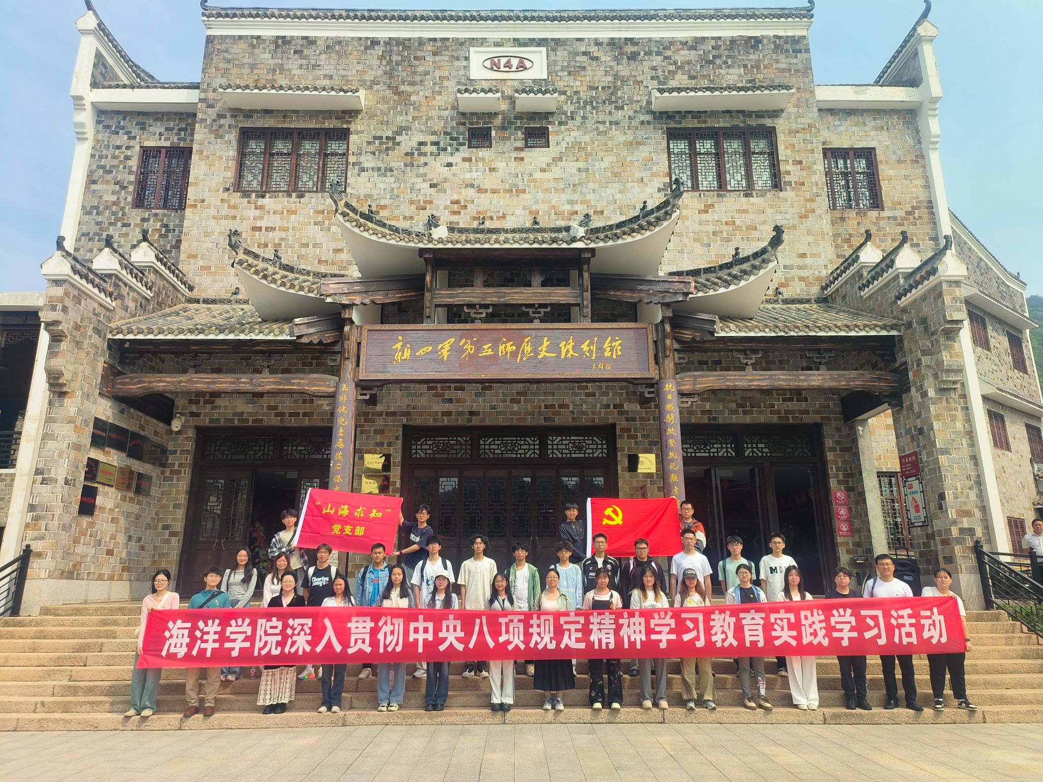 山海求知党支部书记曾范鑫同学表示“我们此次齐聚姚家山村,共同追寻革命先辈的足迹,重温抗战精神,不仅是对历史的缅怀,更是对八项规定的严格遵守与践行。在升旗仪式、向烈士敬献花篮、重温入党誓词的仪式中,我们深刻感受到作为新时代青年党员的责任与使命。随后的陈列馆和抗战旧址的参观,则让每位参与者在历史的沉淀中汲取力量,铭记先辈们为国家和民族所作出的不懈努力。此次活动不仅增强了我们的历史责任感,也激励我们在今后的学习和生活中,始终坚持党的原则,严守八项规定,努力做一名合格的党员、干部。通过这样的学习与反思,我们将更加坚定地传承红色精神,勇毅前行。”