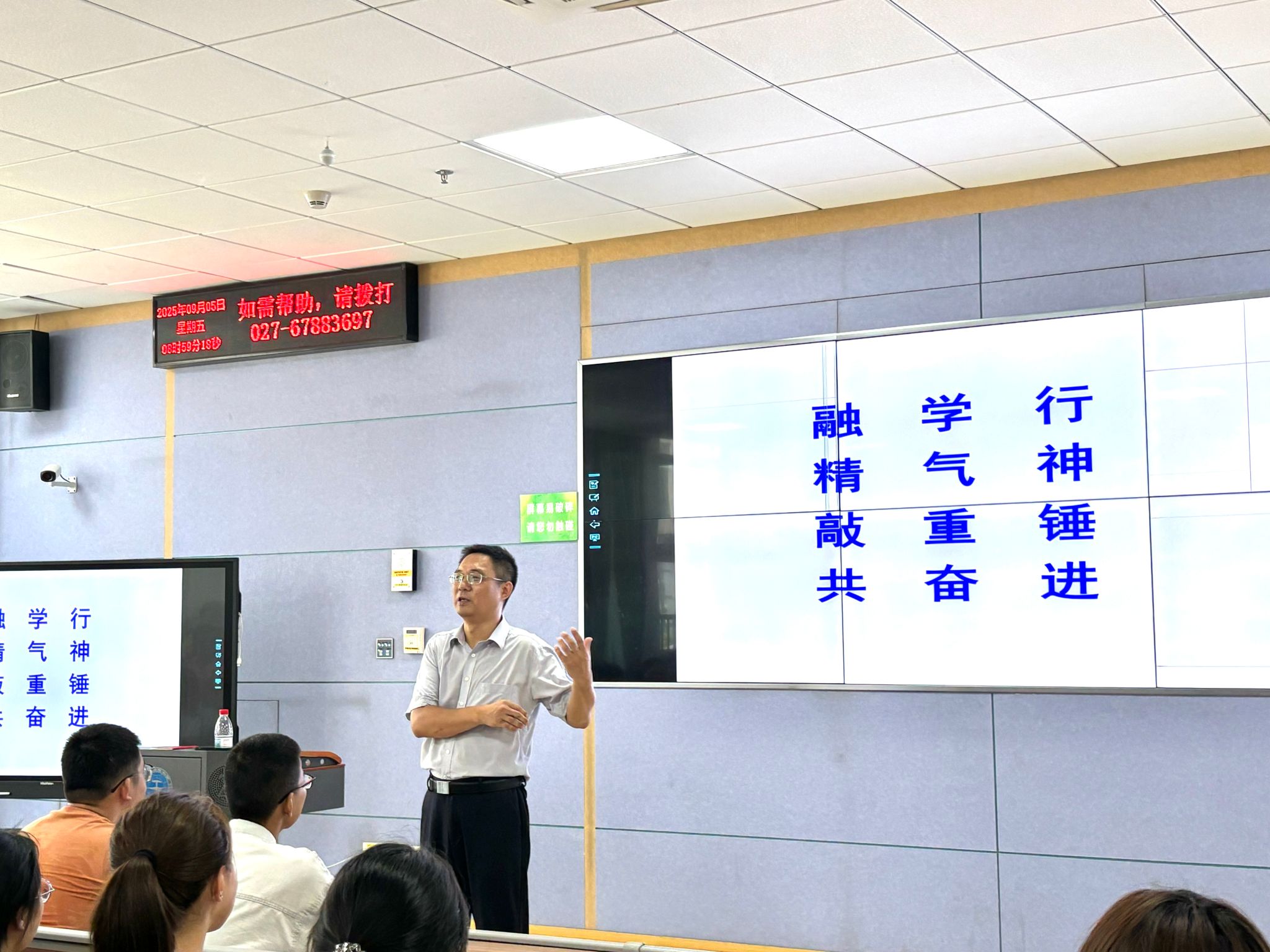 上一环节在同学们热烈掌声中结束后刘国华书记以《难忘(南望)迹忆》,展示了学院迎新现场、家长见面会、院领导到宿舍看望新生等情景,同时引入主讲内容的第二模块《自我赶考》:他以大学四年重要时间轴为脉络,和大家分享如何让自己始终坚定信念、遵规守纪、学业为首、全面发展,真正做到能静心、明目标、善思考、勇创新、入主流;他讲到必赢线路检测中心学子在本专业学什么、解决什么问题、怎样解决问题,如何主动出击学会用好时间、资源、能力等红利,从“被动接收知识”转向“主动规划资源”,在学思践悟中敢于勇于改变自己,逐步提升自己毕业后的核心竞争力。