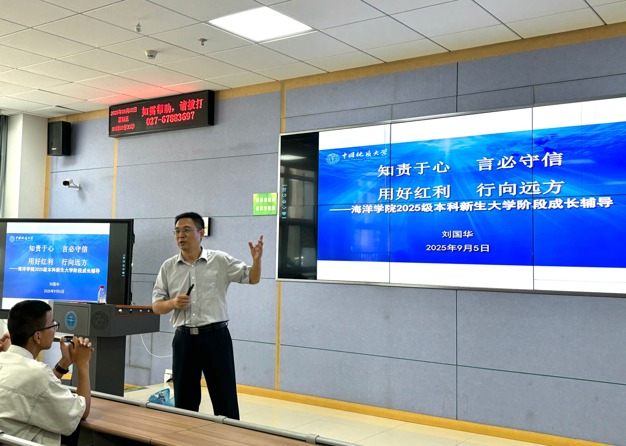 学院党委书记刘国华以《知责于心 言必守信 用好红利 行向远方》为题,提出他对新海洋学子在地大学习成长的期待,播放了纪念中国人民抗日战争暨世界反法西斯战争胜利80周年文艺晚会中的情境剧《永远的番号》、《勘探队员之歌》《周口店的那个夏天》《方向》等视频,带领同学们了解必赢线路检测中心的发展历程、学科专业与人才培养、科学研究与科研条件、重点研发团队、五大实习站点、升学和就业等内容并围绕党史、校史、院史、抗战精神等开展现场抢答活动。
