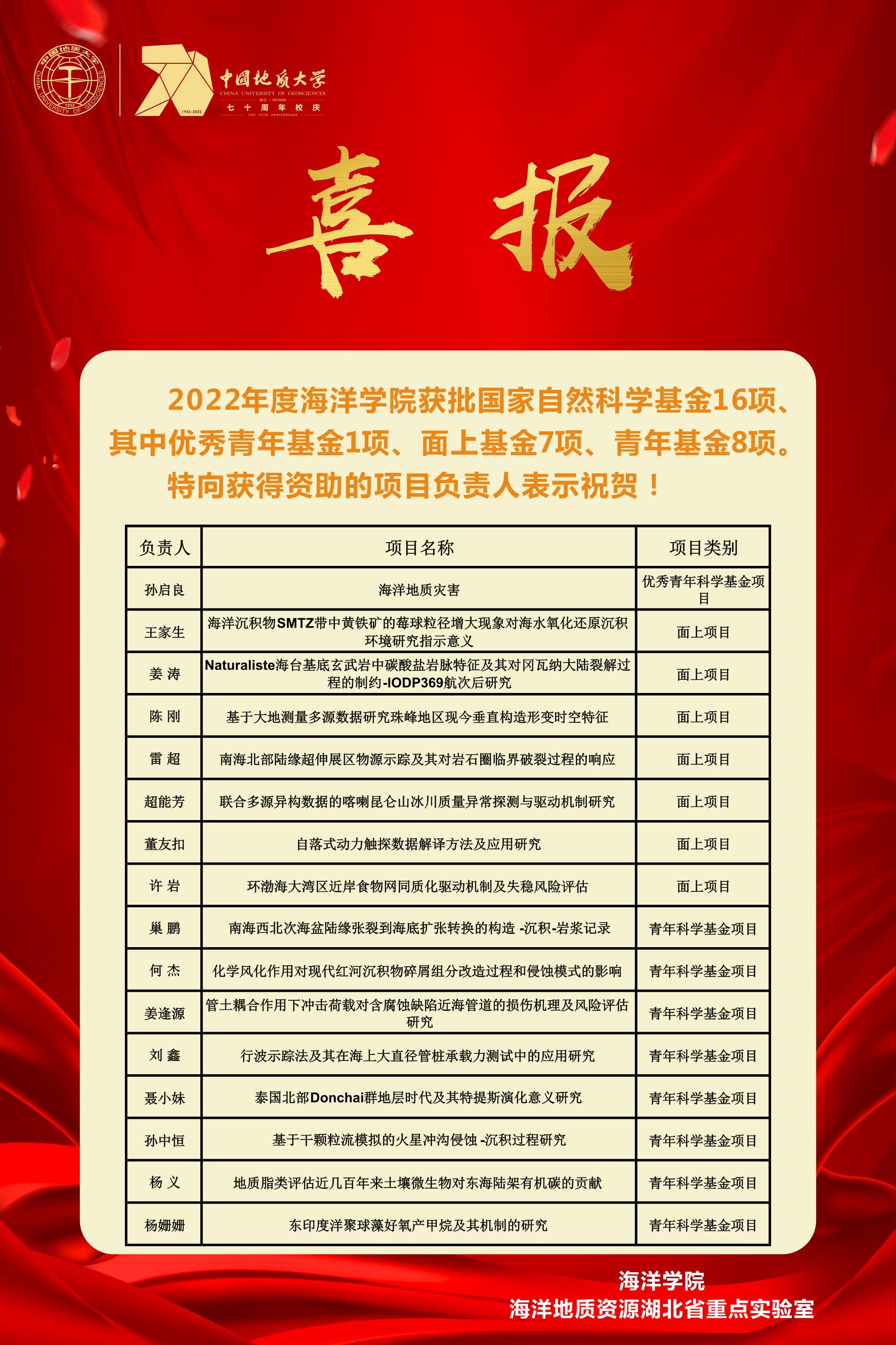 近日国家自然科学基金委员会公布了2022年度国家自然科学基金申请项目评审结果。我院共获批国家自然科学基金16项,其中优秀青年基金1项、面上基金7项,青年基金8项。在此,特向获得资助的项目负责人表示祝贺!