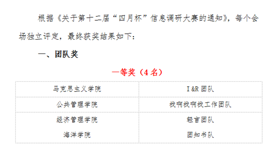 团队成员间的科学分工与密切合作,让本次调研报告得到评委的一致青睐,分会场第一名实至名归。同时,我院在本次大赛中凭借良好的组织工作,荣获“优秀组织单位”称号。