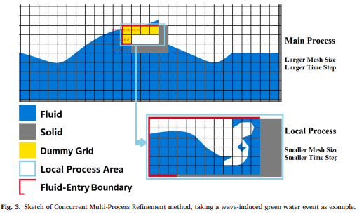 A Concurrent Multi-Process Refinement method for fluid-structure interaction (FSI) problems is developed and applied in a SIMPLE-based monolithic implicit method (SBMIM) initially presented by Hu et al. (2016). Concurrent Multi-Process Refinement method refines the computational domain of FSI simulations as several subdomains in multi-processes with multi-grid sizes and multi-time steps. Through file mapping, velocity and pressure data are transmitted between two processes using proper interpolations and time advance strategy. Numerical implementation and algorithm procedure of the method are explained in detail. Simulations of the liquid sloshing in a baffled tank are conducted to give an error estimation on different grid systems using the Grid Convergence Index (GCI). Simulations of the dam breaking flow slamming a vertical wall are conducted to verify the accuracy of present methods and to discuss the area selection of the localized FSI simulation. Simulations of the green water impact caused by freak wave are conducted to show the performance of this method in dealing with multi-scale ocean engineering problems and high-frequency structural vibrations. From results, it is seen that Concurrent Multi-Process Refinement method shows advantages in multi-scale FSI simulations using monolithic FSI methods and in predicting high-frequency structural vibrations, especially with low-cost computational facilities.