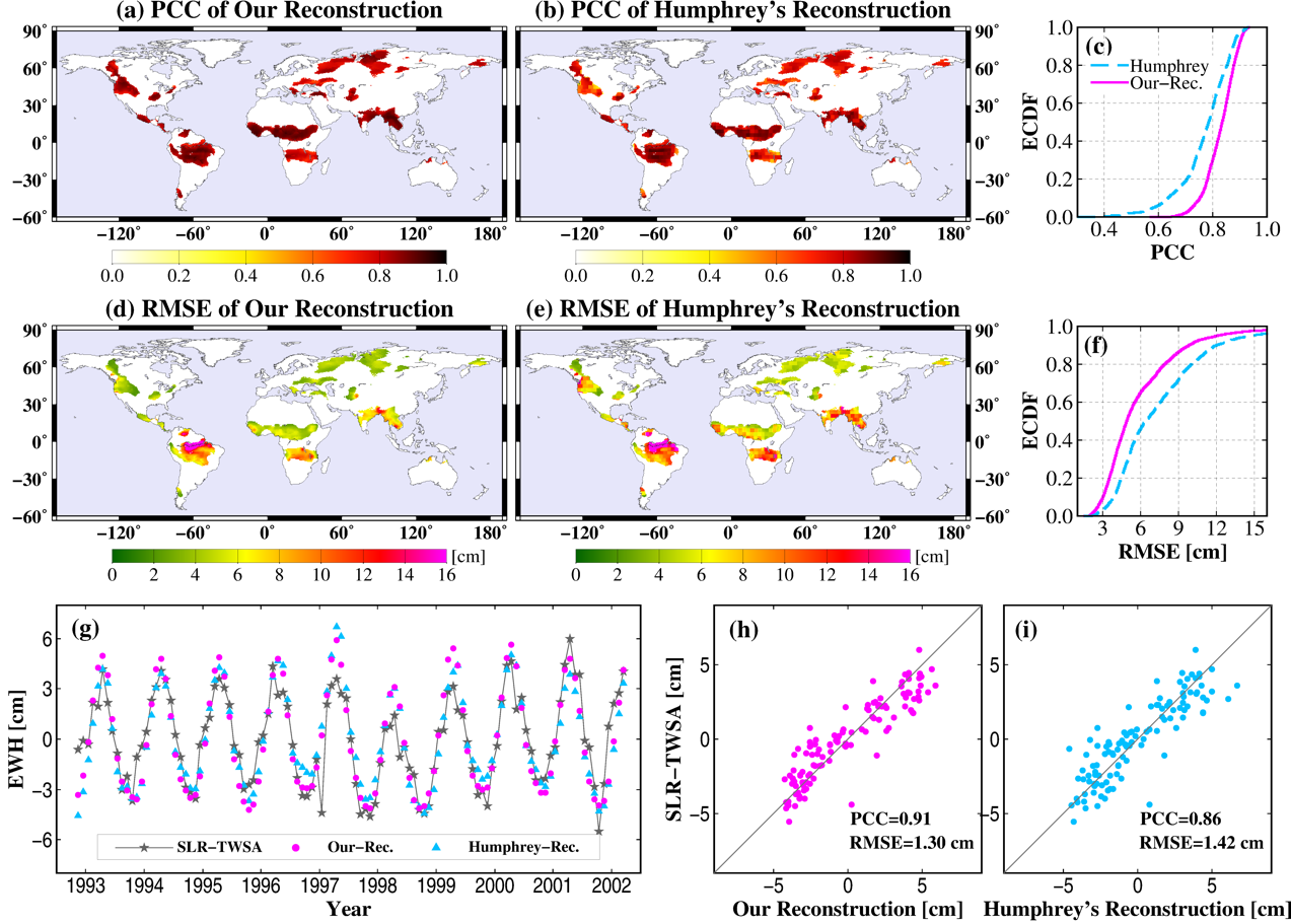 图2. SLR数据检核结果。(a)本研究数据集和(b)Humphrey数据集与GRACE时期以前(即1992年11月至2002年3月)SLR数据之间的皮尔森相关系数(PCC)。采用SLR数据计算的(d)本研究数据集和(e)Humphrey数据集的均方根误差(RMSE)。 图2c和图2f分别展示了图2(a-b)和图2(d-e)的的经验累积分布函数(ECDF)。 图2(g-i)展示了两组重构数据集与SLR数据在流域尺度上的对比结果。