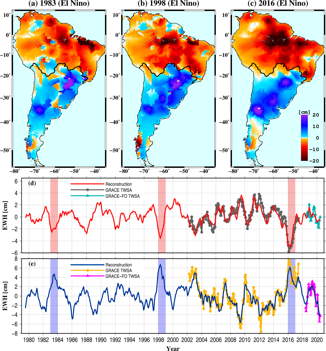 图1. 重构数据集在南美洲地区强厄尔尼诺年份(a)1983、(b)1998和(c)2016的年均变化图(即空间分布)以及南(d)北(e)部地区流域平均变化时间序列。其中南北部地区用黑线划分(见图1a-c)。