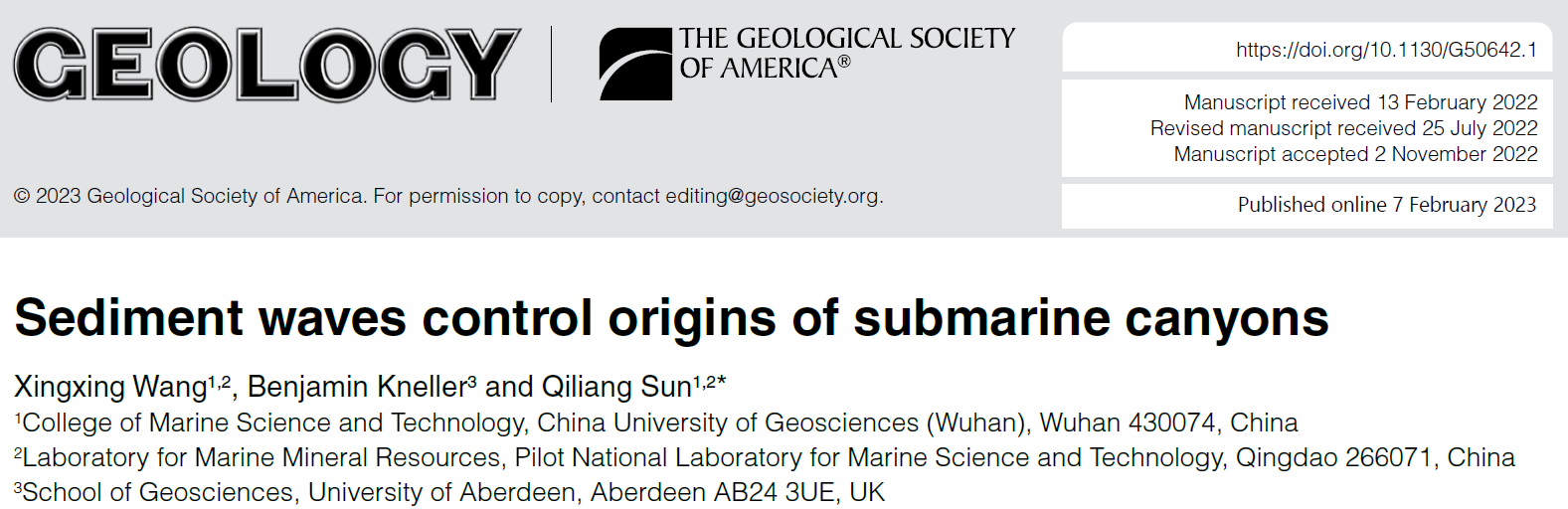 我院王星星、孙启良老师在《Geology》上发表论文--沉积物波控制海底峡谷形成