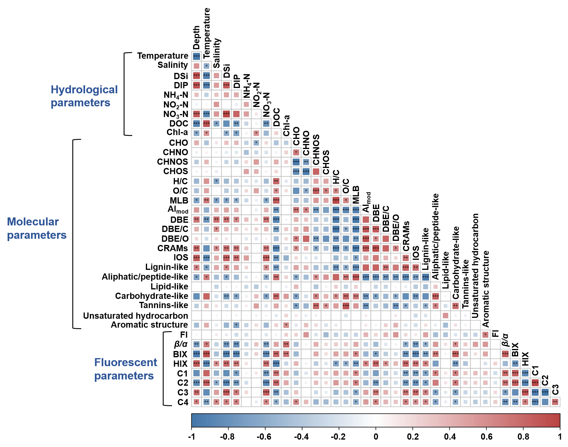 图4. 水文参数、分子参数和荧光参数之间的相关性分析。