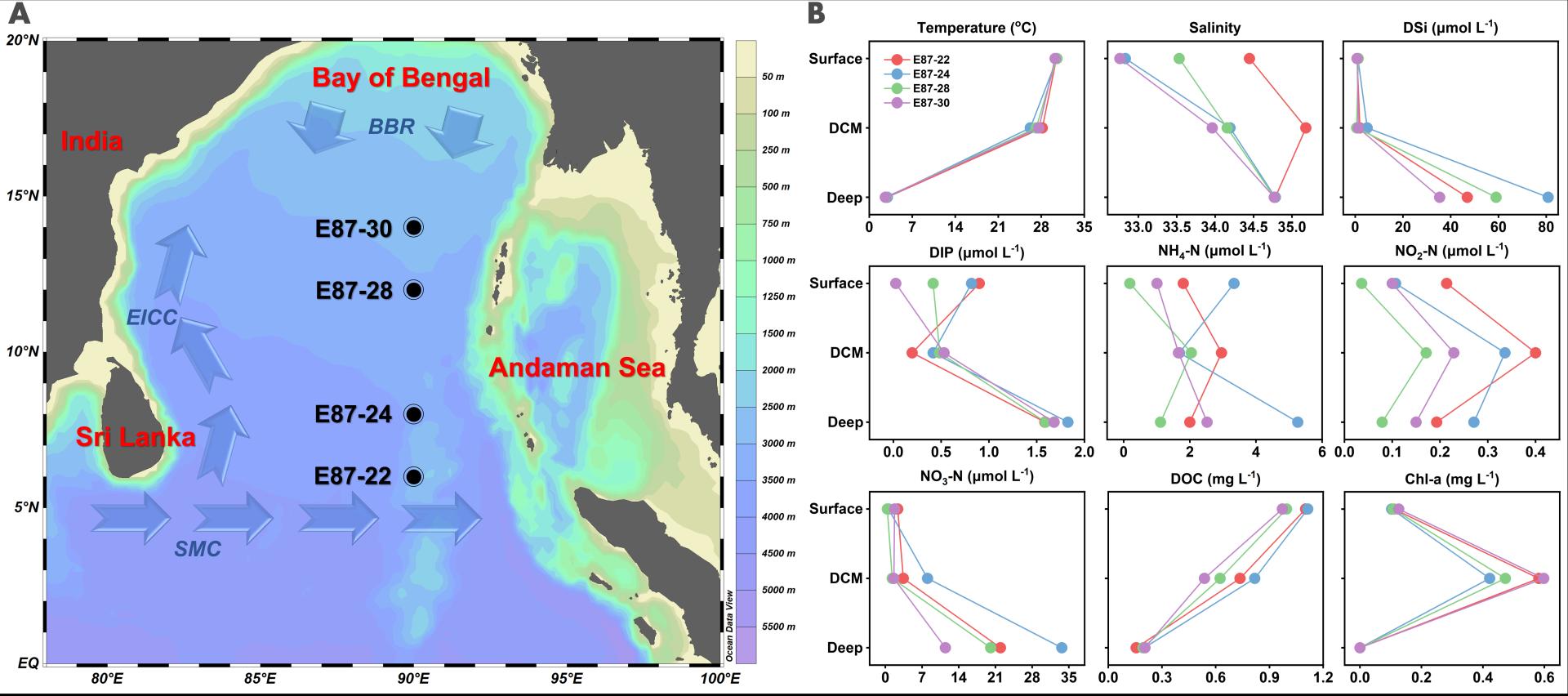 图1. 2022年东印度洋(EIO)的采样站位图(A)和水文参数(B)。