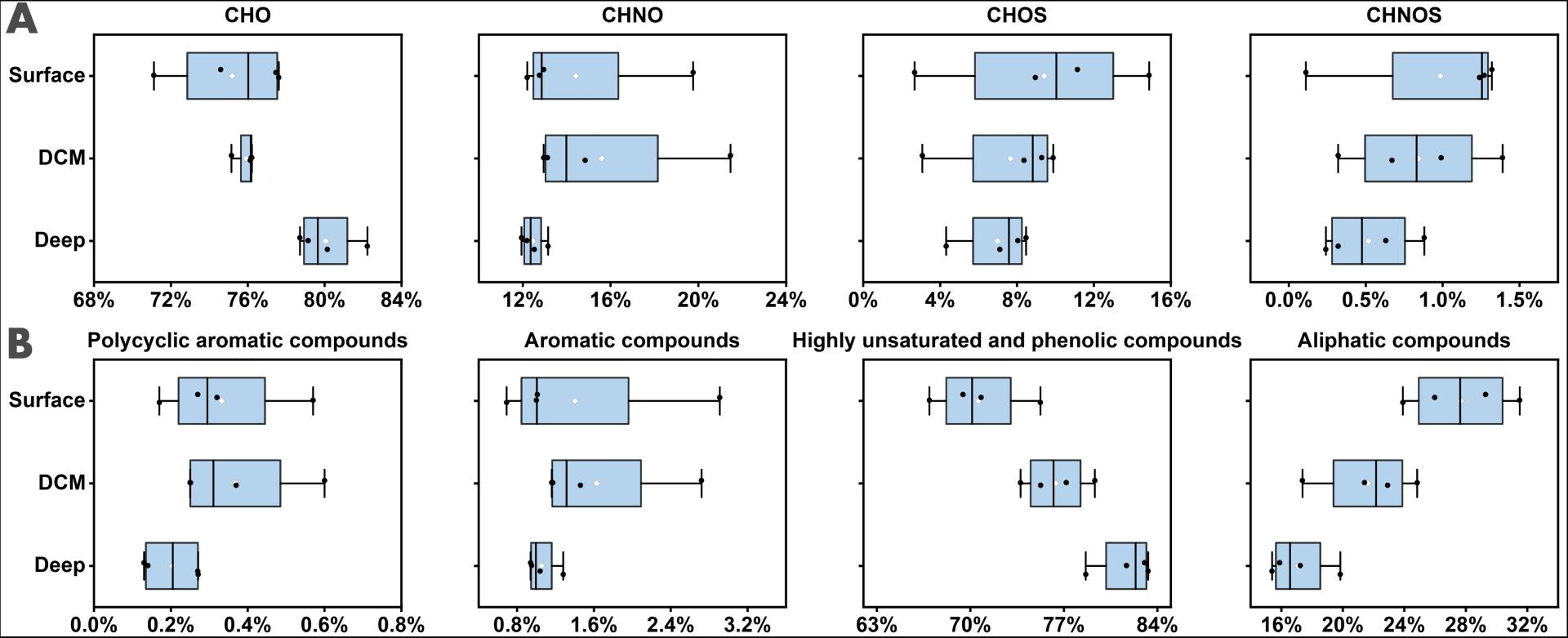 图2. DOM分子(CHO、CHNO、CHOS、CHNOS)(A)和分子类群(B)相对强度的垂直变化。