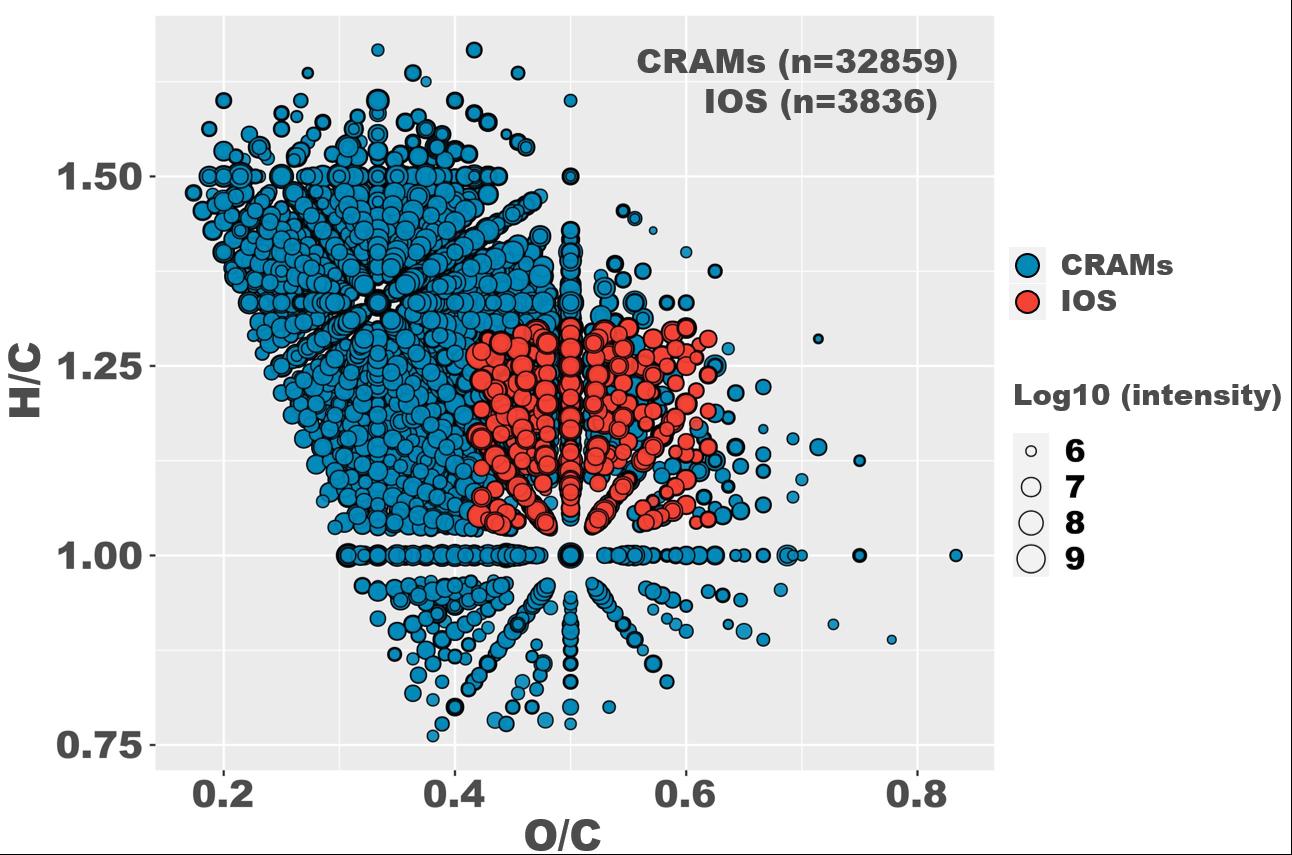 图3. 所有DOM样品中CRAMs和IOS分子的Van Krevelen(VK)图(H/C vs O/C)。
