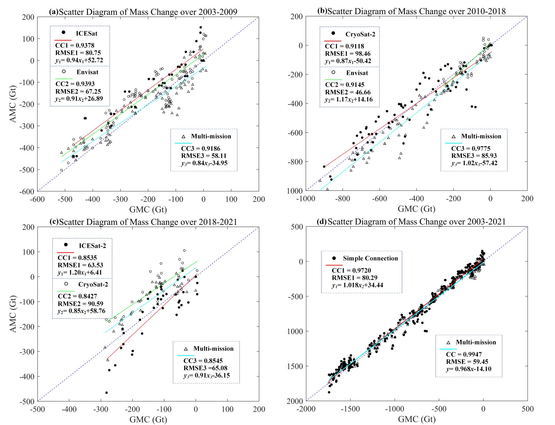 图 3 2003-2009年(a)、2010-2017年(b)、2018-2021年(c)和2003-2021年(d)卫星测高估计得到的质量变化与GRACE/GFO卫星重力数据间散点图