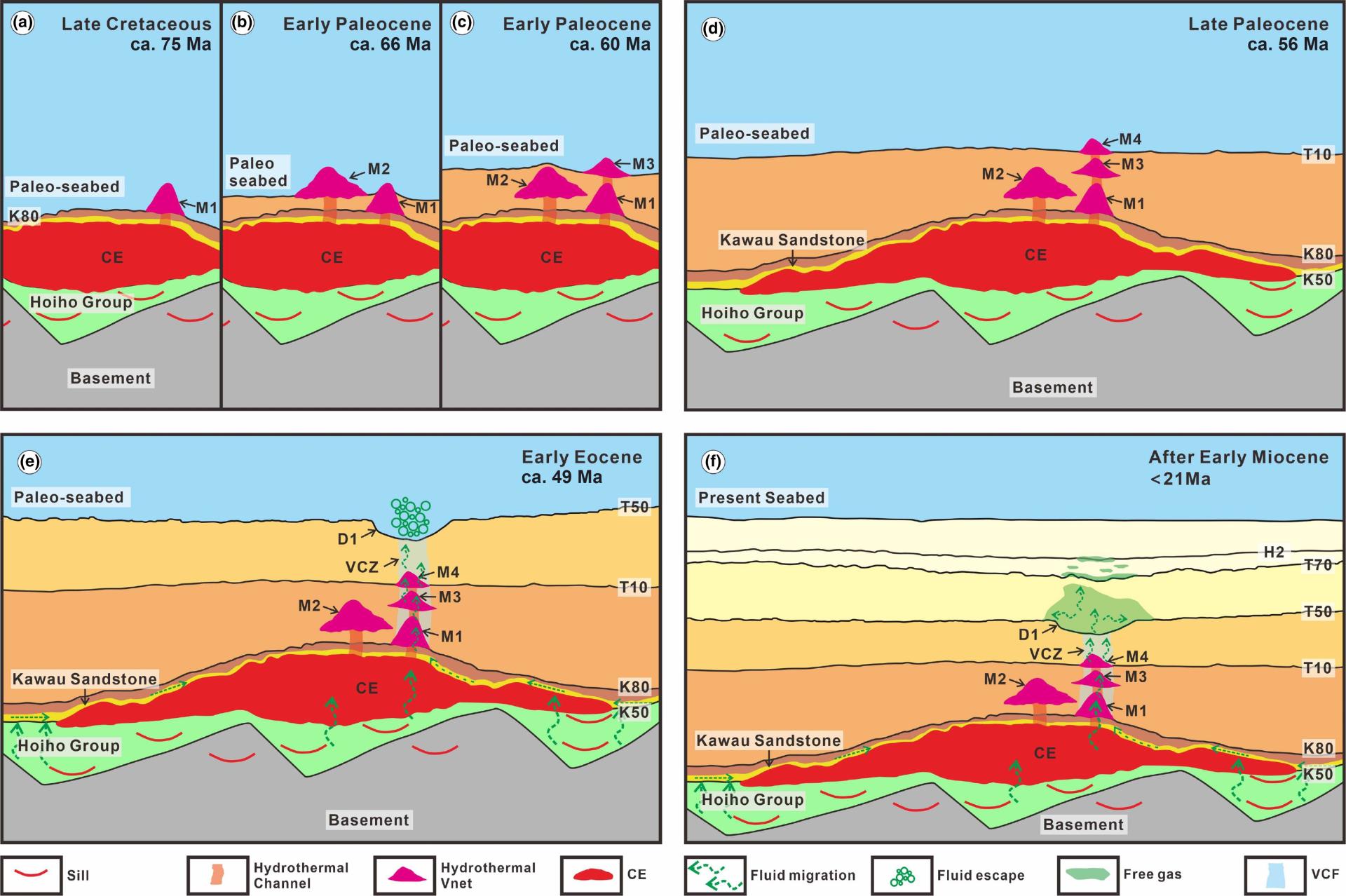 热液通道作为岩浆活动研究中的重要一环而被广泛研究,但是针对其本身特性的研究仍存在不足,热液通道能够作为盆地内各类流体的输运通道已被前人证实,但其可持续活动的时间上限尚不清楚;另外断层能够作为岩浆的输运通道,但在大南盆地缺乏明确证据表明区域内的岩浆通过断层侵入到盆地内。我们的研究通过对大南盆地岩浆活动的研究,为以上问题提出新的见解与认识。