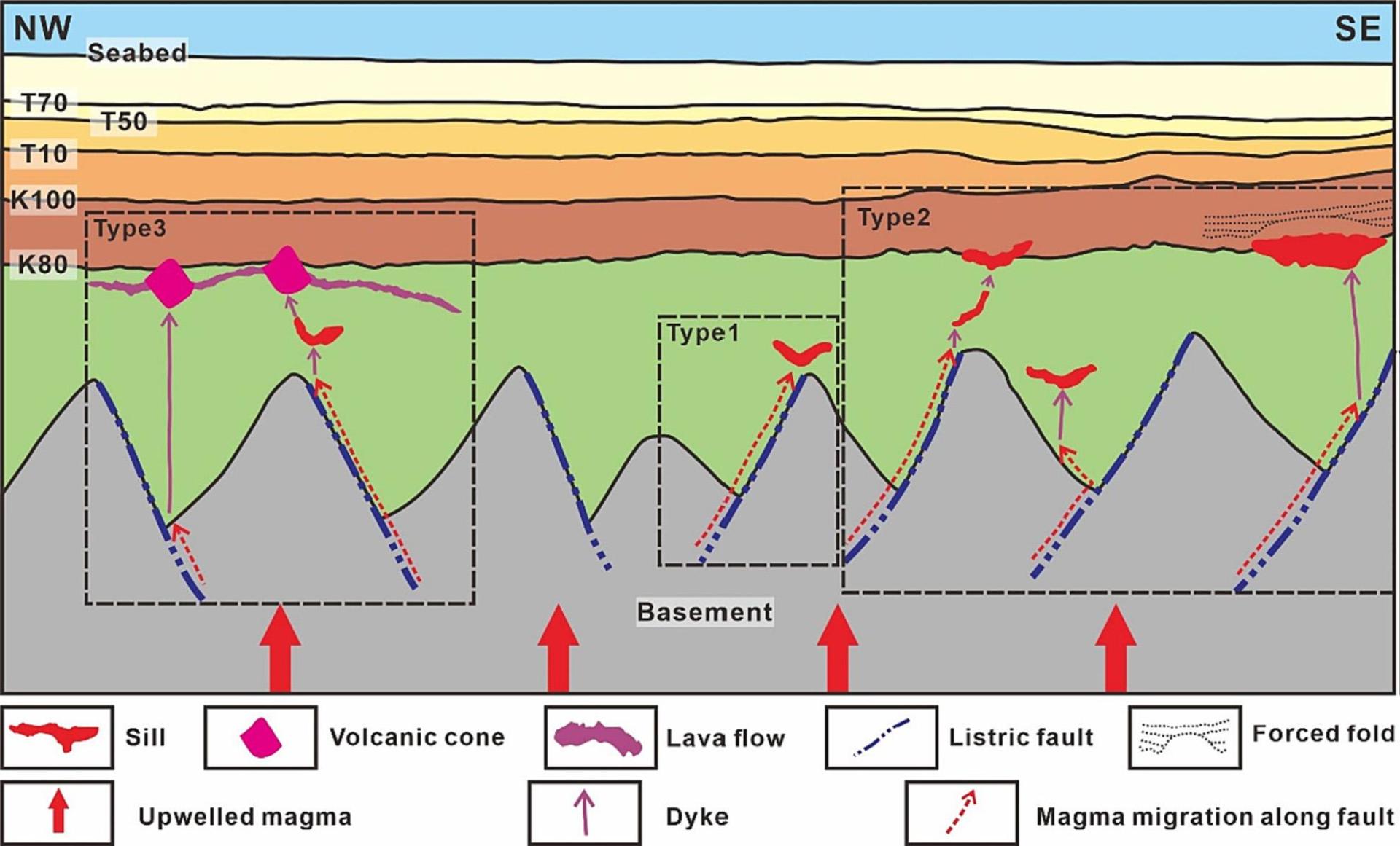 本研究揭示了大南盆地裂后期岩浆输运系统以及热液通道的可重复利用性。板内减压熔融形成的岩浆沿先存的断层向上输运至盆地的沉积地层内,随后通过岩墙向盆地浅部侵入,并形成岩床或喷出地表形成火山。在这个输运体系中,断层是岩浆穿越基底的重要通道,影响了盆地内岩床的分布。在沉积盆地内的热液通道可在一定的时间内被多次重复利用。在本研究中,沿同一条热液通道形成了3期热液喷口,并在早渐新世时期,通道内的流体喷出海底形成麻坑,流体痕迹最晚可在早中新世地层中观察到,通道持续活动时间超过54 Ma。本研究强调热液通道在沉积盆地内的关键作用,其能够帮助岩浆突破相对刚性的基底,也能长期、持续的为盆地内的各类流体资源(如烃类等)提供向上输运的通道。本研究对全球沉积盆地内热液通道的研究具有重要的启示意义,并提供了更新、更具代表性的案例,本研究所取得的认识能够适用于研究区以外的地区。