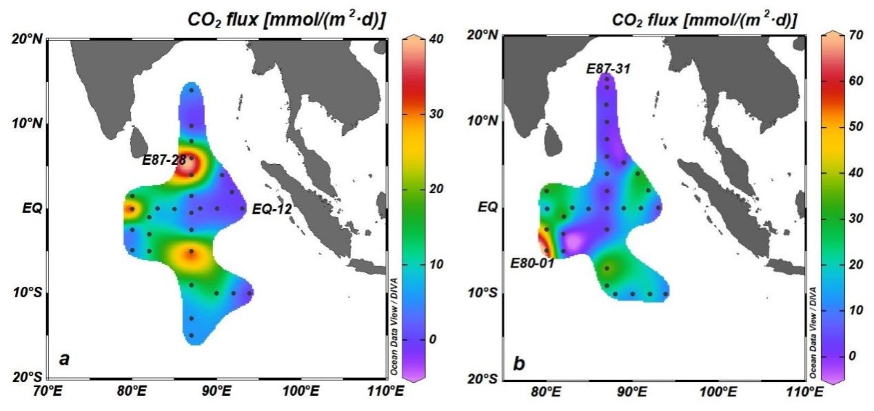 2020年秋季和2021年春季CO2的平均海气通量分别为10.00 mmol/m2/d和16.00 mmol/m2/d,表明在研究期间EIO是CO2的源。
