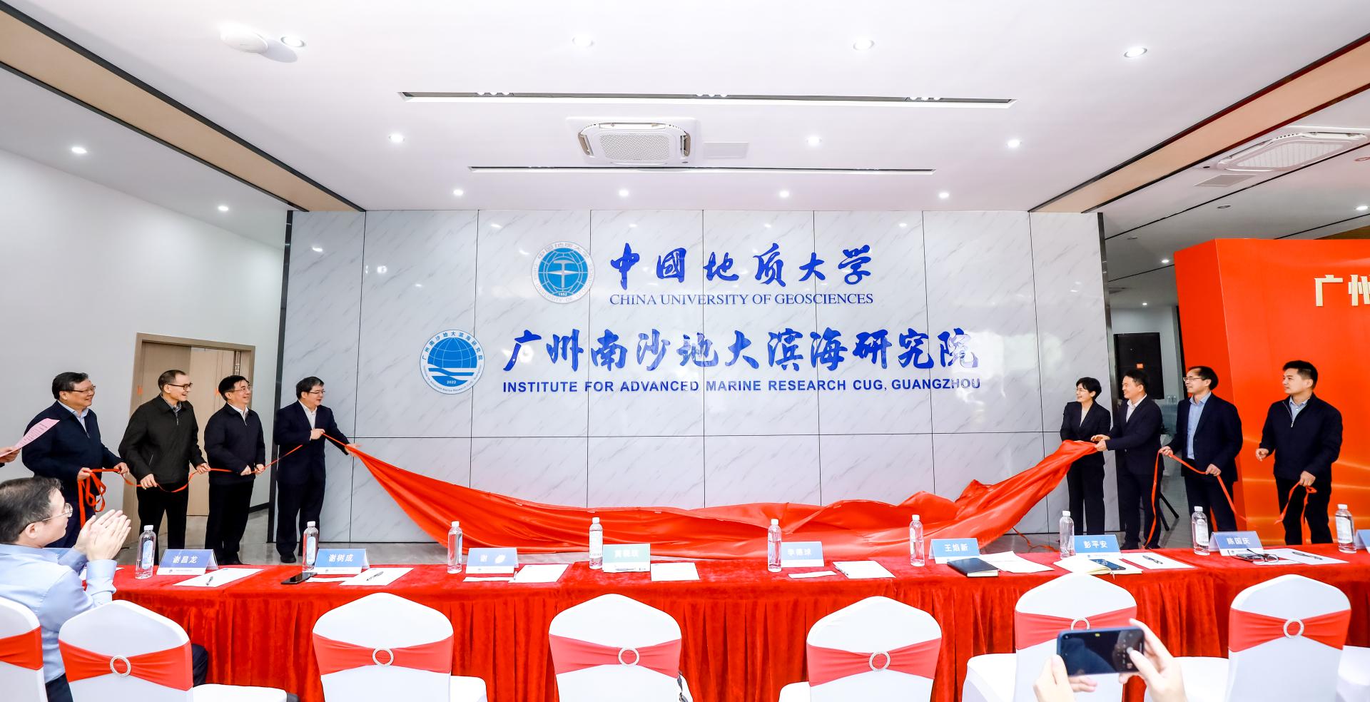 李德球、谢伟、陈国庆、黄晓玫、王焰新、储祖旺、谢树成、彭平安共同为广州南沙地大滨海研究院揭牌。